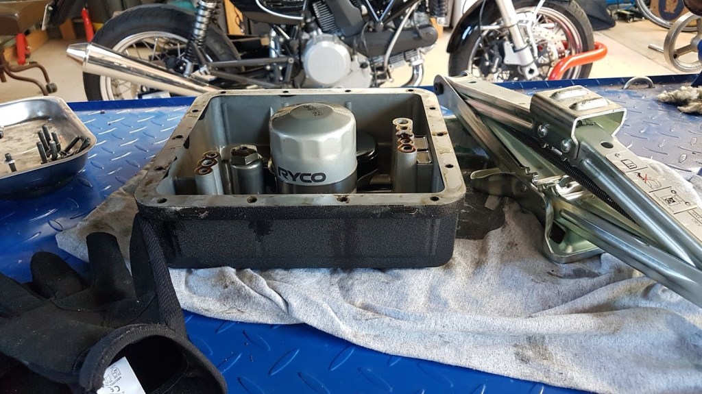 The gasket, which I’d reused from previous oil filter changes, was of a thin, plastic-type material. The new one, from Mario at Thunderbikes in Perth, was thicker and more fibrous.