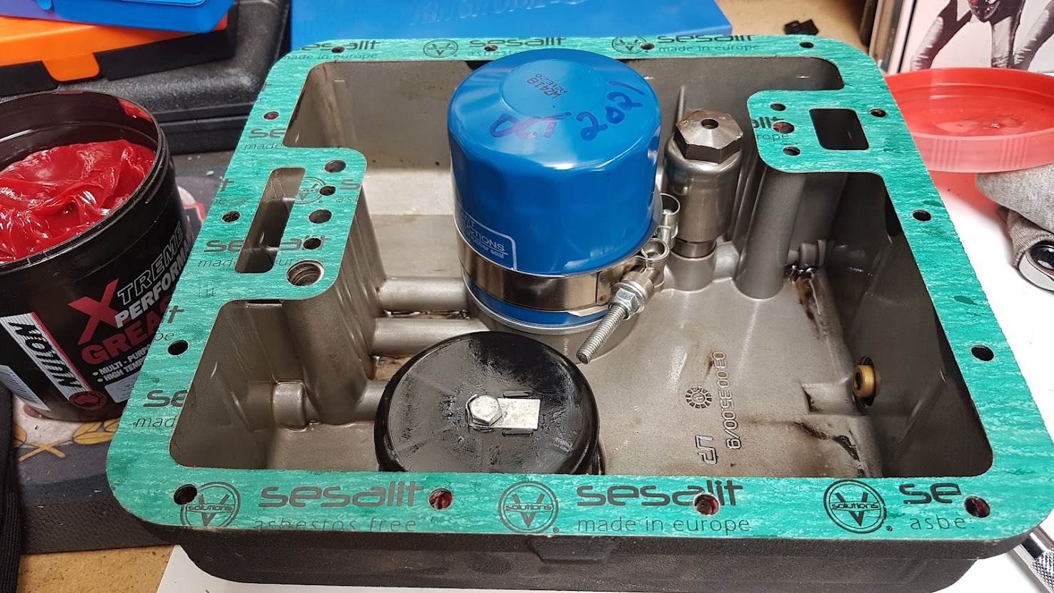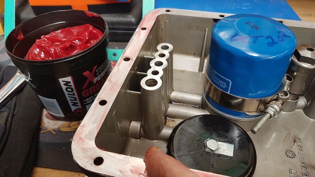 I ran a thin smear of grease around the sump and the top of the gasket – it allows the sump to move around slightly as I insert the sump screws, and to seal the sump when tightened up. Filled her up with Penrite 15W50 Diesel.