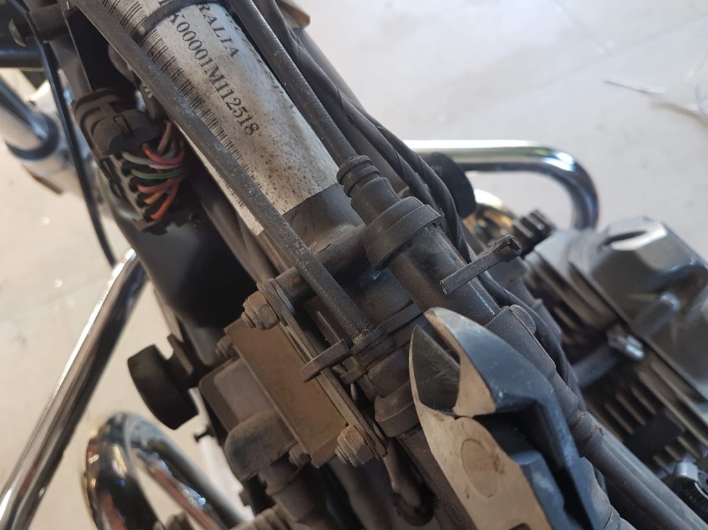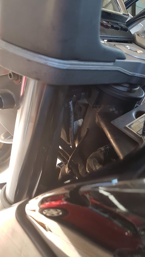 This was my error. Some years ago I’d removed the headlight to replace the globe. In ignorance, I’d pushed the headlight binnacle back into place without considering the routing of the clutch line and electrical cables. It was now clear to me that the lines should be moved to the right (as facing the bike) and that the headlight binnacle shape would hold them in position, away from the steering stem.