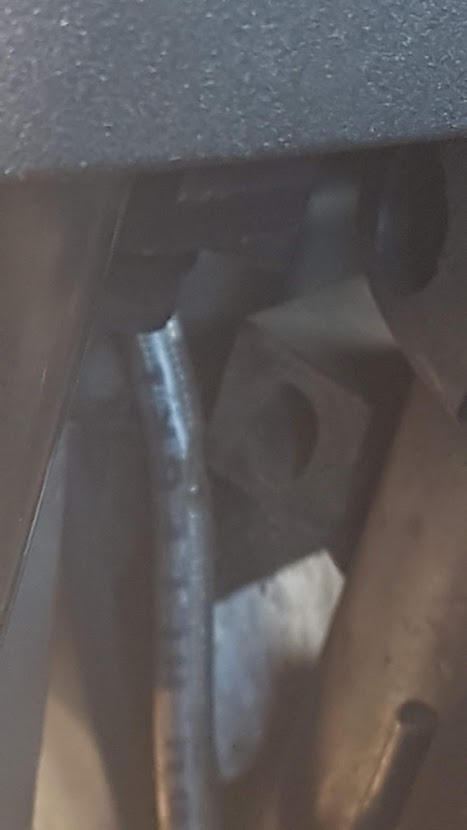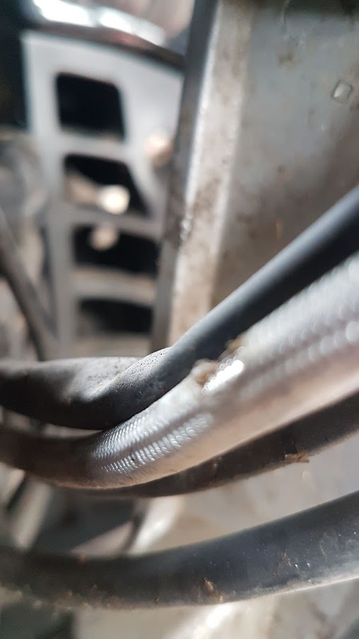 After my trip to Tocumwal Aviation Museum, I was sitting on my shed stool checking the Breva’s engine oil when my eyes passed over the tank to the steering stem where I noticed a brake line chaffing against a sharp steel edge. As I moved the handlebars, a right turn dragged the line across the corner of the steel block.