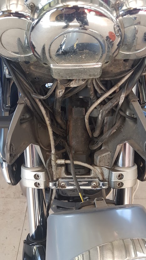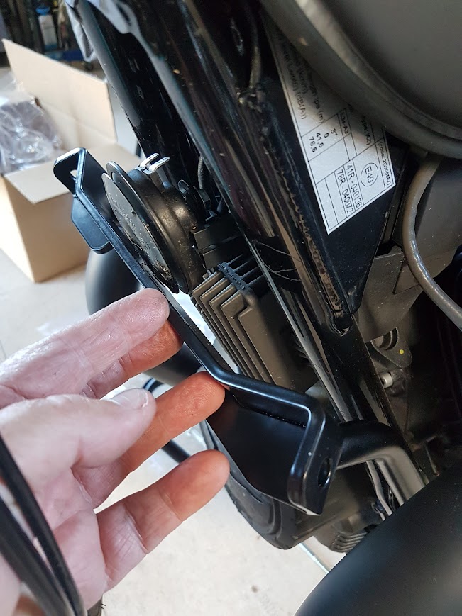 Sat back and admired my skilfulness. Then tightened all the nuts and bolts. I relocated the horn to the crash bar; there was just enough free play in the two wire connectors.