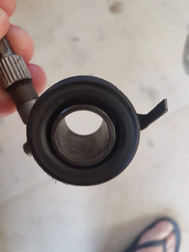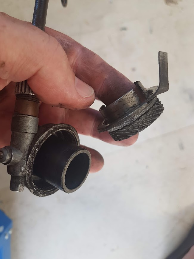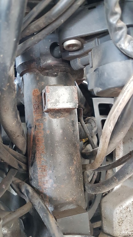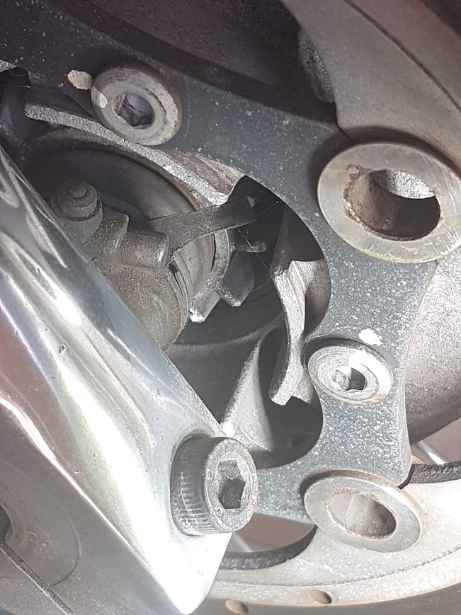 I loosened the front wheel bolts and removed the brake callipers, jacked up the Nevada a smidgeon, removed the front wheel and the speedo mechanism. The speedo tang had definitely seen better days.