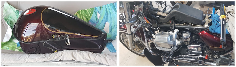 I poured some fuel into the tank and left it overnight. No leak. I smeared some rubber grease onto the locating bungs and eased the tank back on – the grease makes the job much easier – and reconnected cables and fuel hoses.