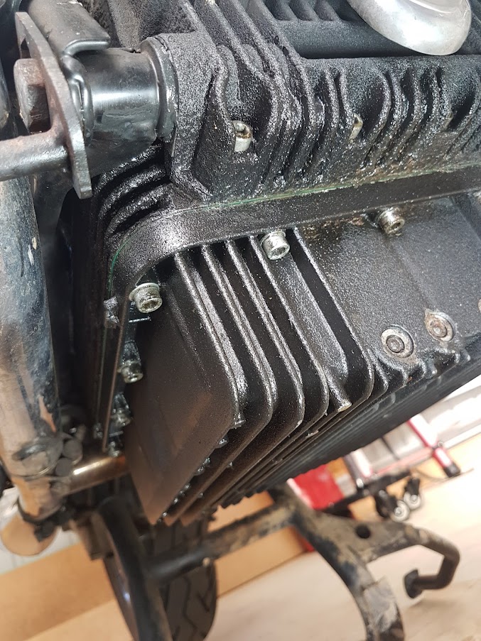Walked into the shed one morning and spotted what looked like an oil leak at the front of the EV’s sump. No oil drip on the floor though. I cleaned it up with degreaser and kept using the bike and, sure enough, it kept sweating out – not enough to leave a drip.