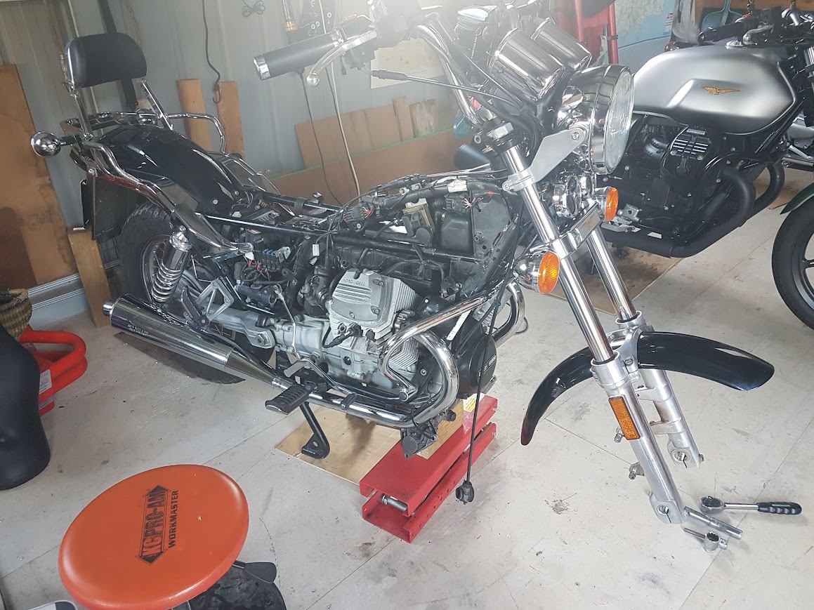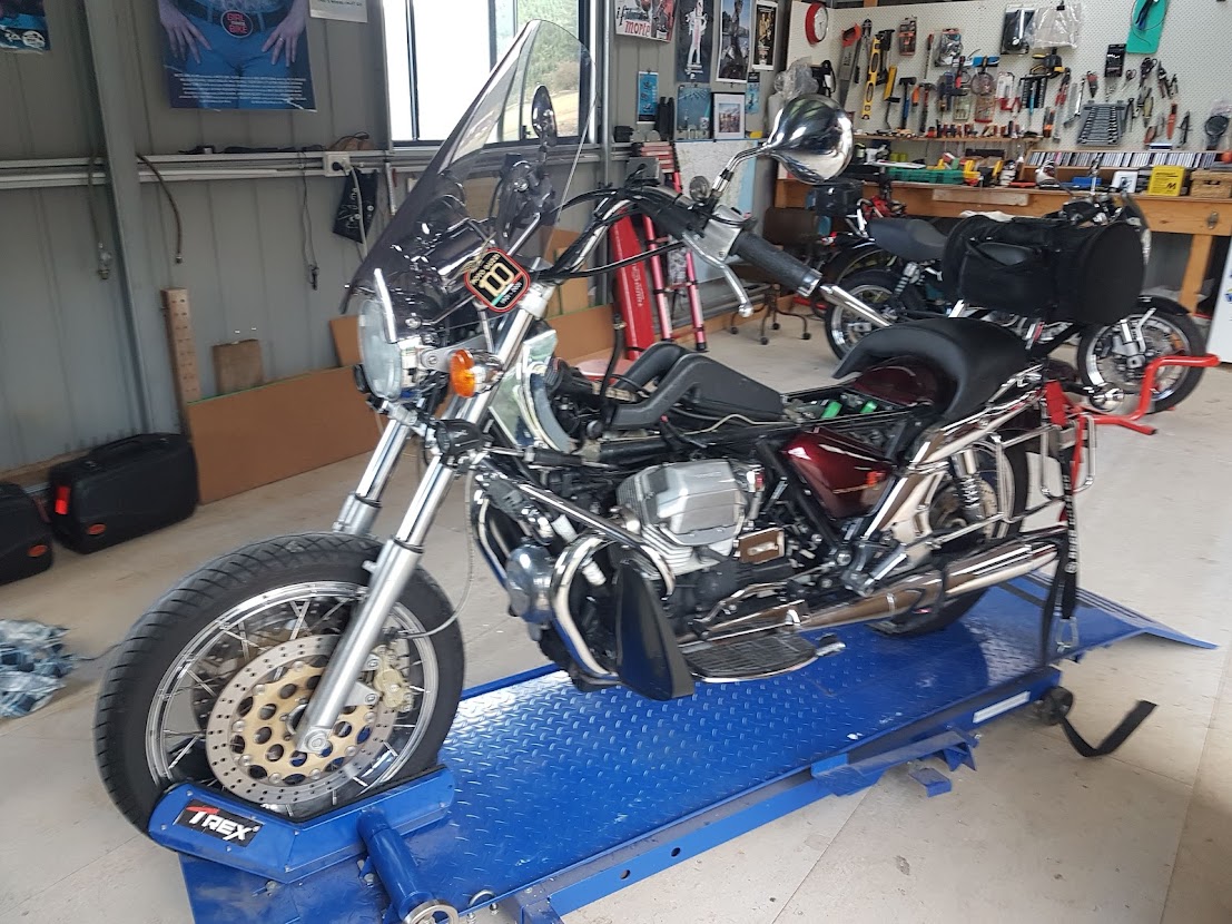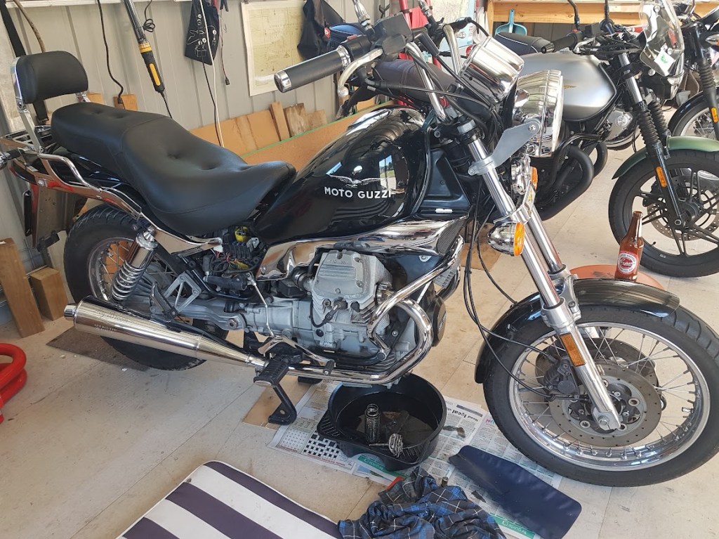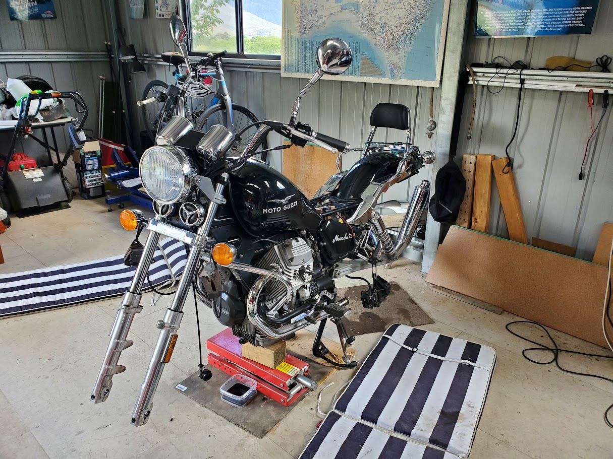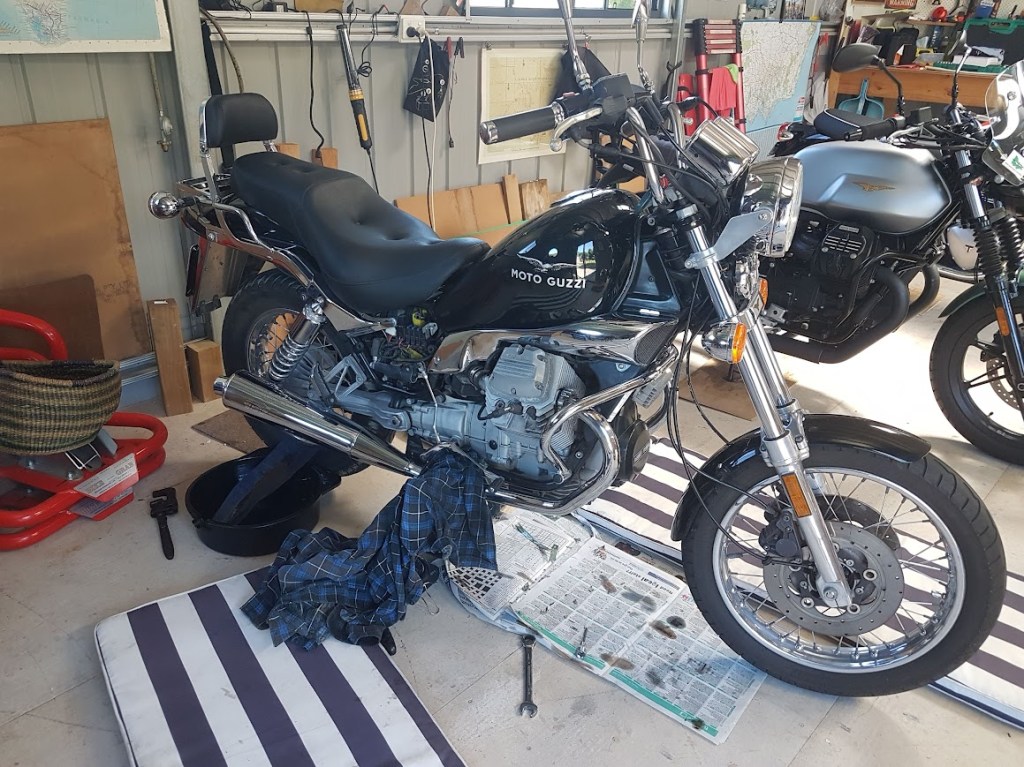 A couple of months ago I bought an unloved 2001 Nevada from a deceased estate. The Guzzi had been de-registered in 2019 and not used since. It started and I had a quick ride, noting the speedo didn’t work. The right-hand side panel was missing. It had 20 years of servicing records, manuals and paperwork. I gave it a clean and it came up very well. I ordered air filter, oil filter, plugs, washers, gaskets and a Veglia speedo tang for the front wheel speedo drive from Thunderbikes in Perth (which, as usual, arrived promptly). I also ordered from Stein Dinse in Germany a RHS panel, parts book, and an odometer reset knob.
