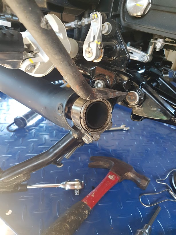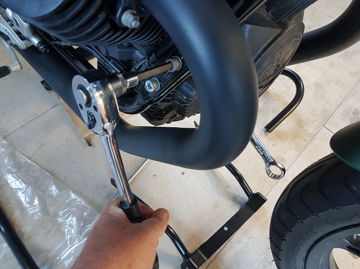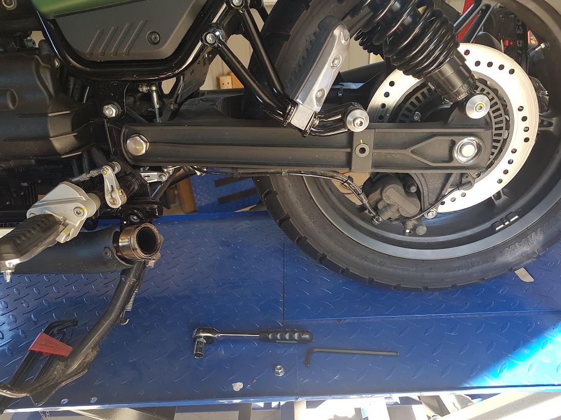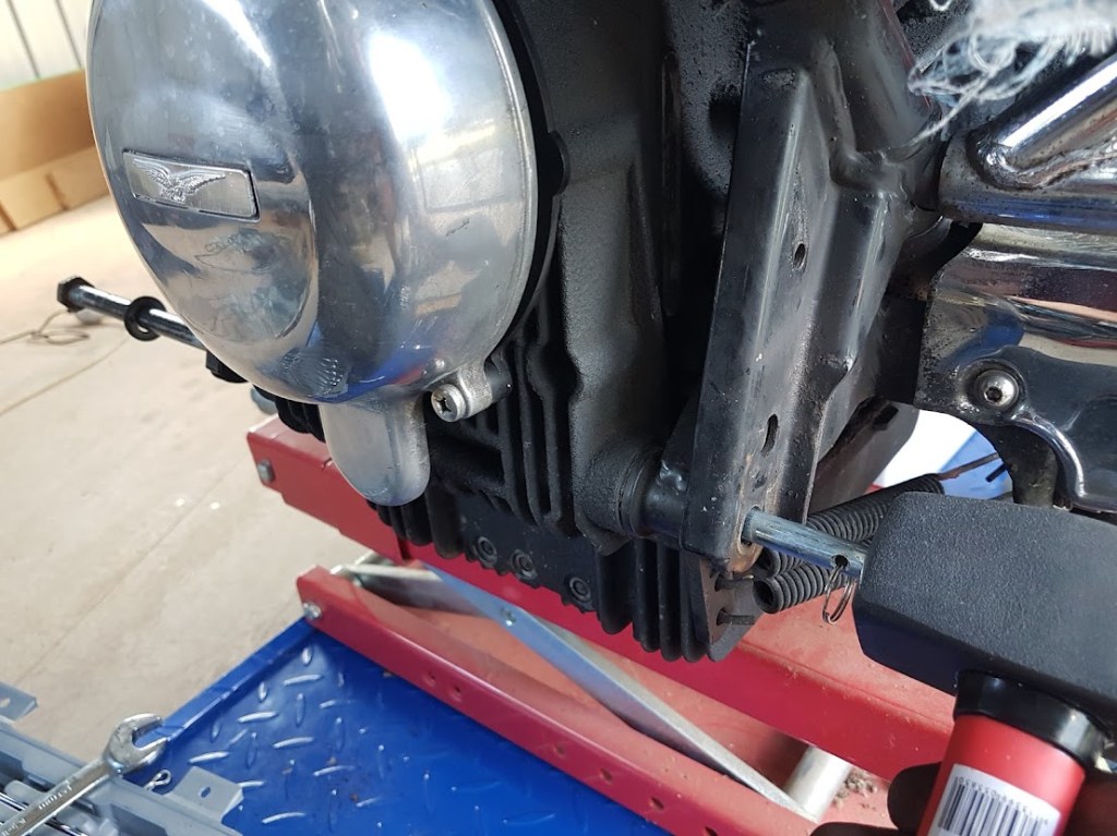 I found that I had to remove both mufflers for ease of access. Also I had to rotate the RHS heatshield to fit one of the stand’s bolts. Judicious use of a crowbar was needed to remove the cross-frame piece and to insert the stand’s replacement. A bit of juggling and cursing saw it all fit in – not something I’d want to do without the table lift.
