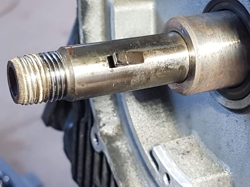 No sign of oil, so the seals had done their job.I used a small chisel and hammer to extract the woodruff key. The cover, spacer and seal (visible to the right) wouldn’t slide off with the key still there. Don’t lose the key! (You can buy a new one from industrial suppliers).