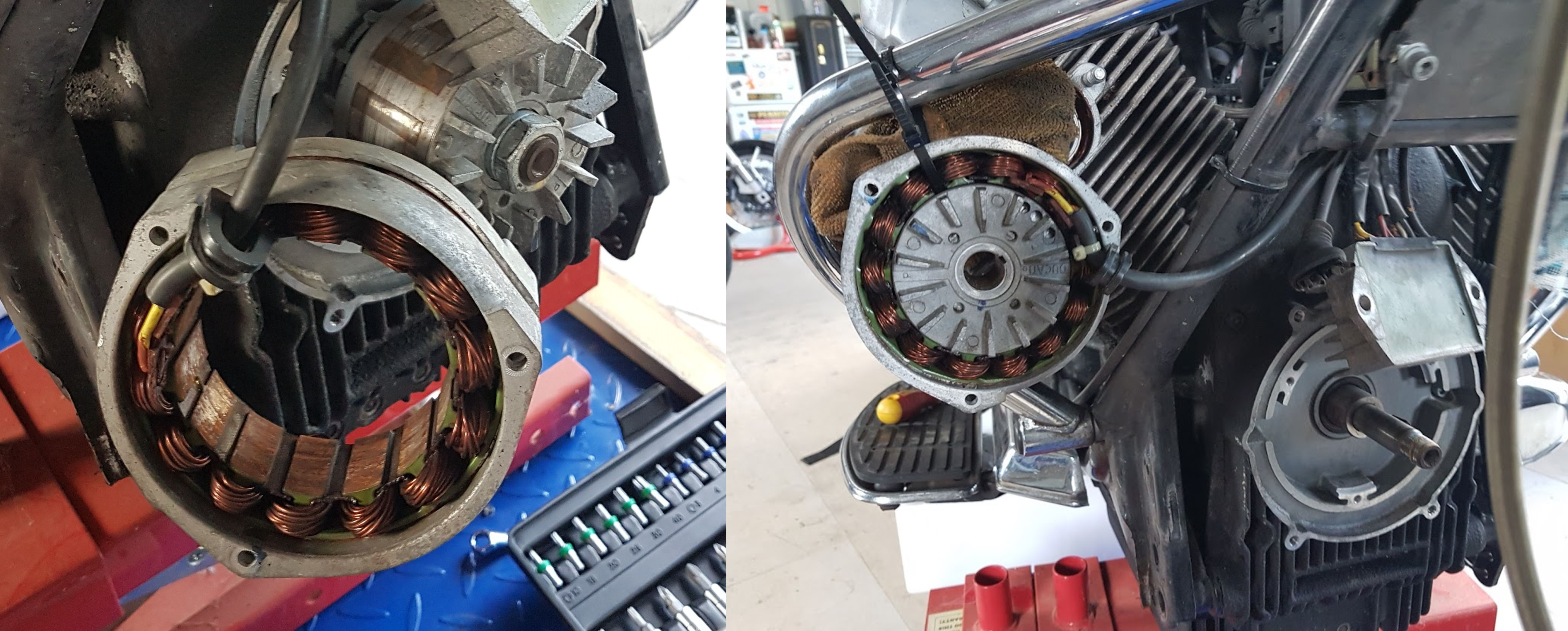Removed the alloy alternator cover which exposed the alternator. Three bolts held the stator on so removed this and swumg it out of the way, still attached to its electrical cable.