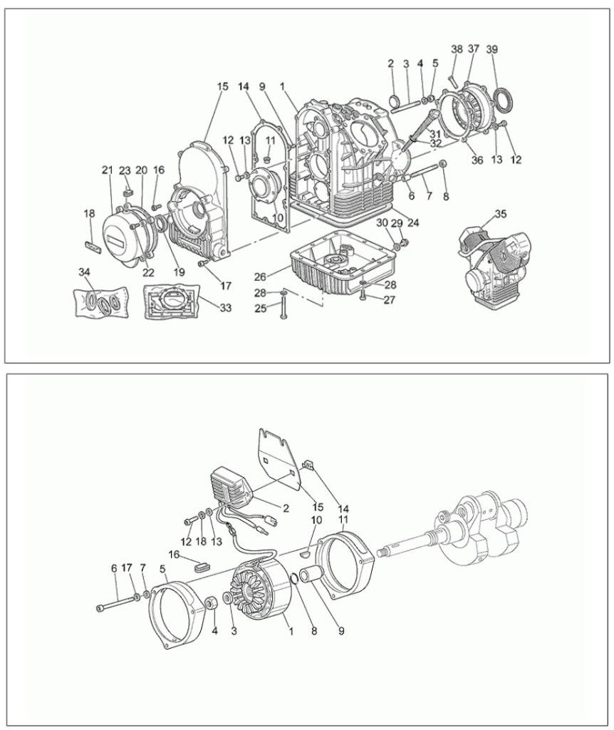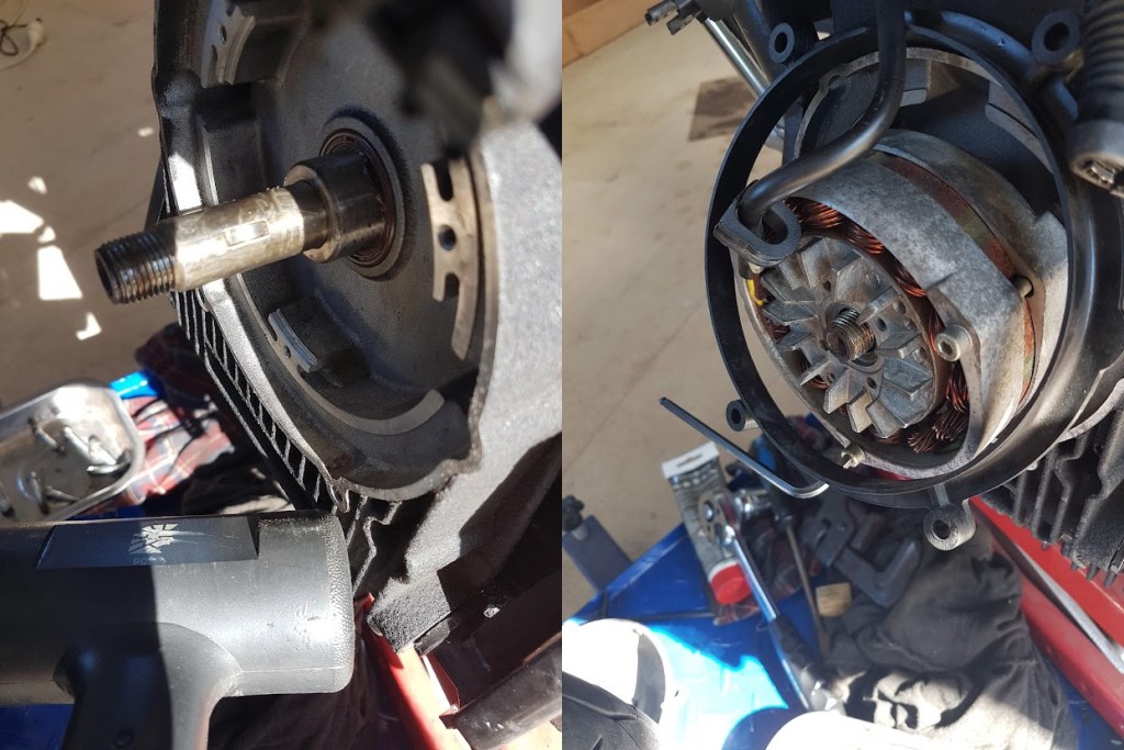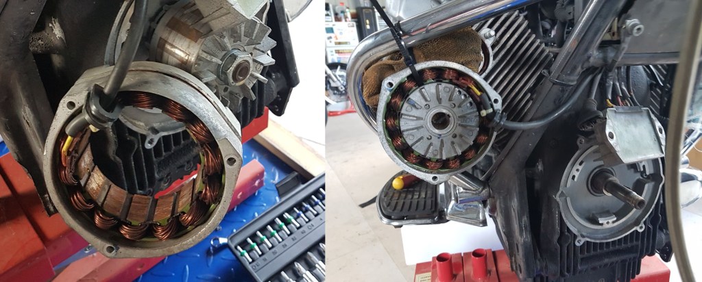 The rotor slid off with a bit of a wiggle. It’s held to the crankshaft by a “woodruff key” for which the rotor has a slot to slide on (No. 10 in the lower parts diagram). I placed the rotor in the stator and cable-tied them to the crash bar.