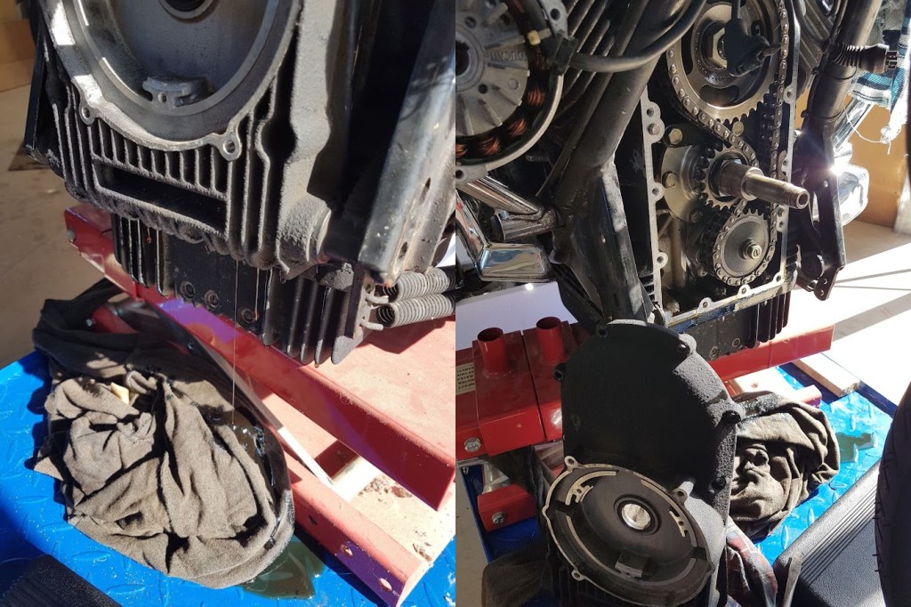 Removing the cover was straight forward, too, though I had to move the horns and the voltage regulator/rectifier out of the way to allow access to the top screws. I noted that the four lower bolts were longer than the rest. The cover came off without drama, the seal sliding over the oily crank. I levered off the base, where it attached to the frame, with a screwdriver. What I didn’t foresee was the cupful of oil that drained out all over my bike lift!