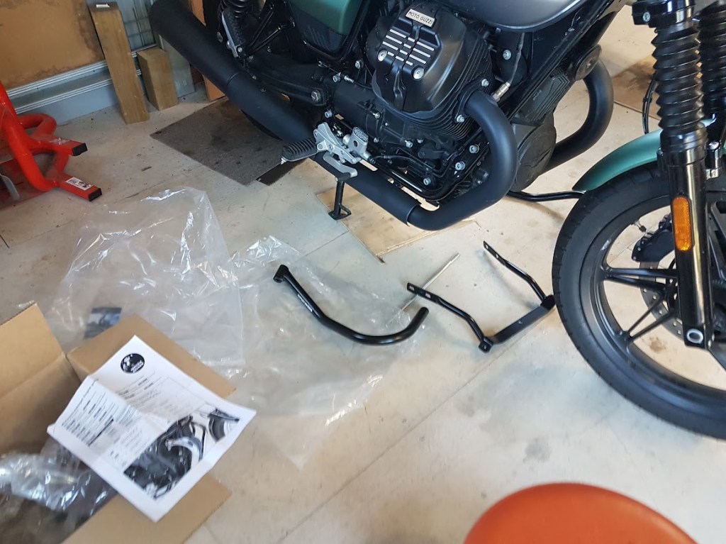 I purchased a set of Hepco-Becker crash bars for my V7-850 Centenario. Despite an expected delay until December, they arrived quick smart in early November. I checked that all the parts were there and read the installation instructions. I was a bit worried about having to remove the bottom engine support bar in case the frame/engine moved. But, in for a penny, in for a pound…