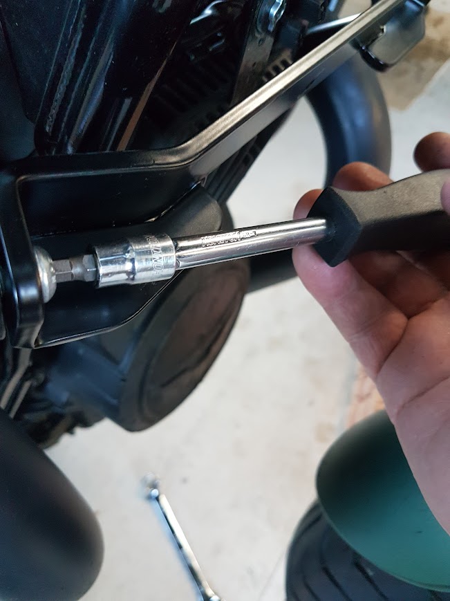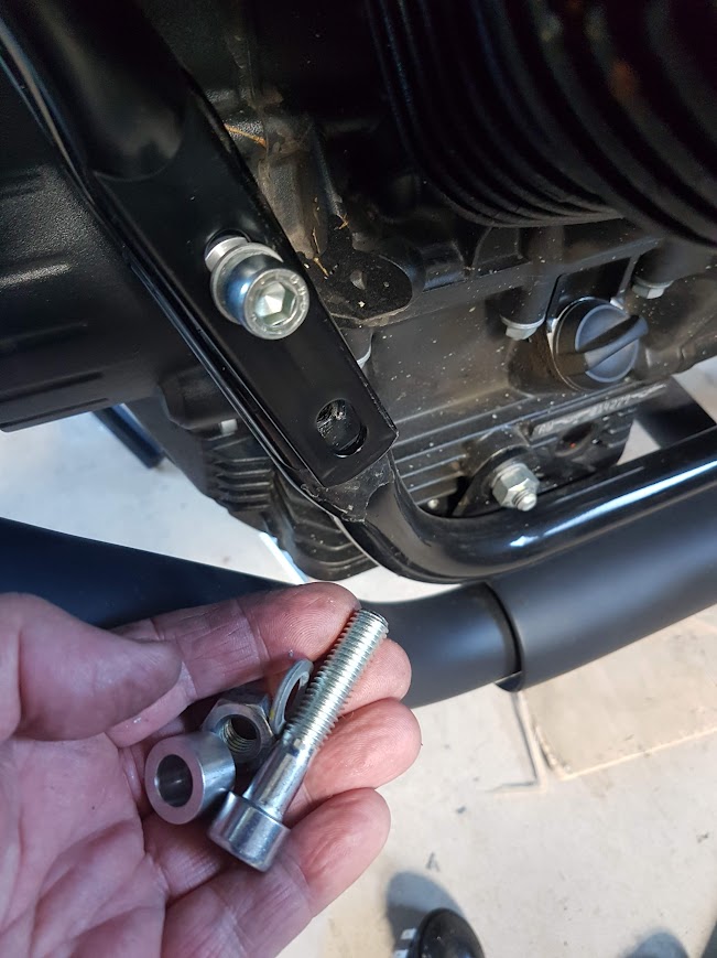 I followed the directions mostly. They said to remove the frame bolts on either side AND remove the engine support bar at the same time. I didn’t like that idea, so removed the frame bolts and attached the centre part of the crash bars first. Loosely tightened up the four bolts for the time being.