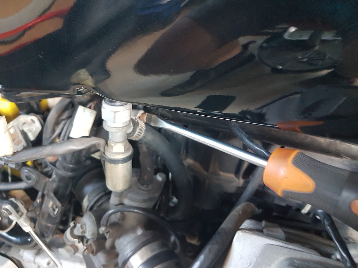 Firstly I had to drain the tank of 15L of petrol, then remove it from the bike. I pumped it out into a 20L container – man that’s heavy, which you don’t appreciate when it’s in the bike. Removing the tank is fairly straightforward; undo the retaining bolt under the seat, pull the tank back off its locating bungs, unplug the electrical cables to the solenoid and fuel-level indicator (it helps to prop up the tank with a block of wood to do this), undo the hose to the fuel solenoid, undo the hose to the pressure regulator at the front, lift the tank up and remove the overflow hose underneath, and carry said tank to somewhere soft where it won’t get scratched.