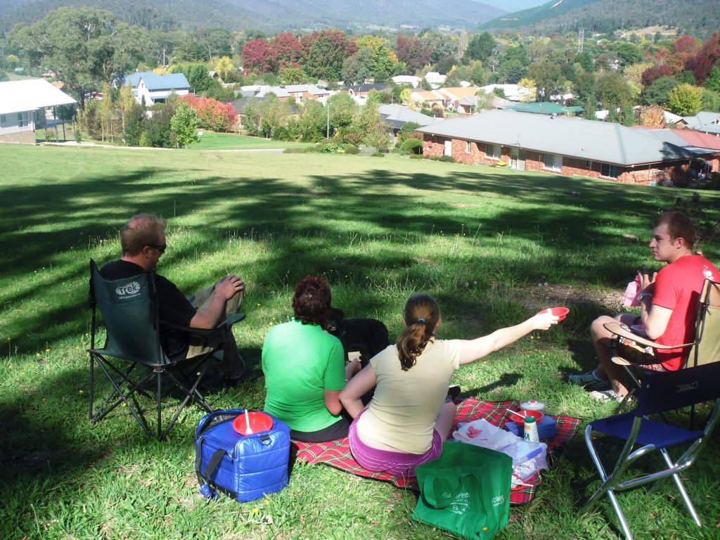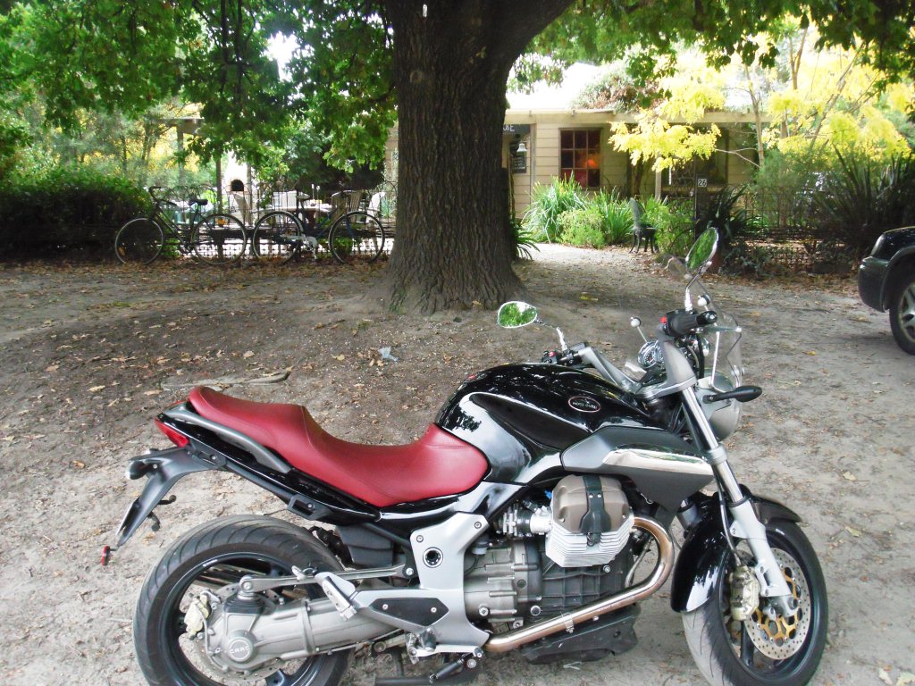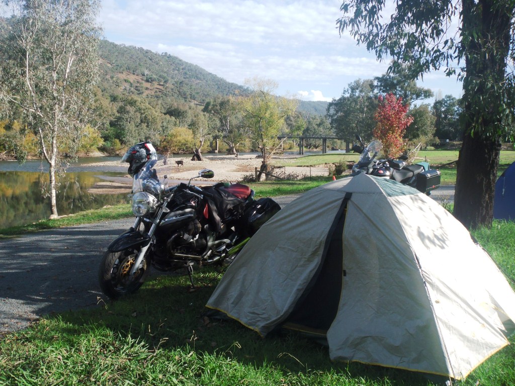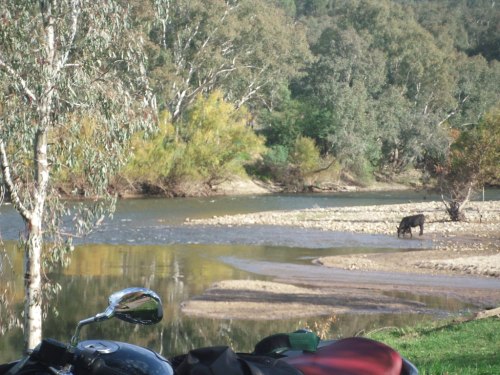 Once a year, the Victorian and New South Wales Moto Guzzi clubs meet on the border at Jingellic on the Murray River. I took the quick way up, on the freeway to Glenrowan, then cut across through Beechworth – which was packed, so no coffee stop – Yackandandah – ditto – Tamgambalanga, Huon, along the shore of Lake Hume to Tallangatta for fuel and lunch.
