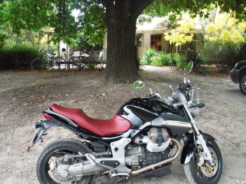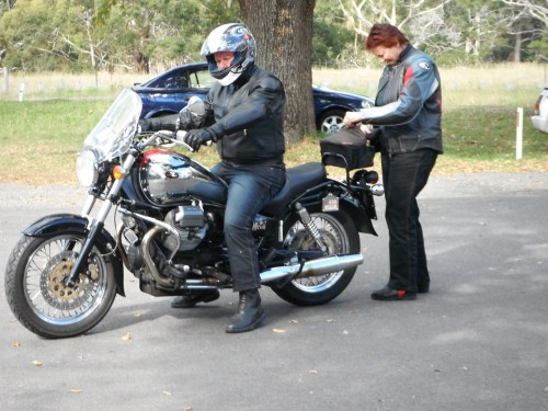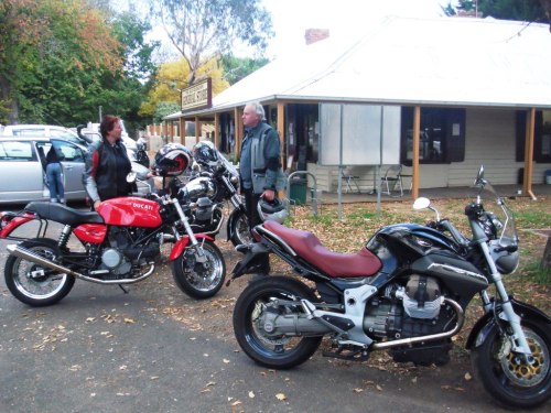 Some of the bods had arrived on Friday, and bikes continued to arrive during the afternoon. About forty or fifty rolled up from afar afield as Merimbular and Sydney. After a meal at the pub we loaded up the fire and sat around drinking and yacking. Kev and Karen from Guzzi Overland were there. They had risen that morning and rode all the way to Dead Horse Gap, in the Kosciusko National Park, and back! Soon they’ll be on their way to South America.