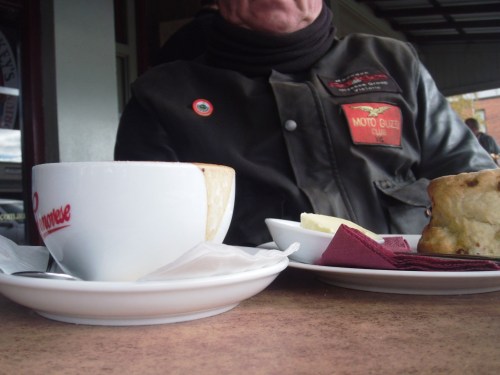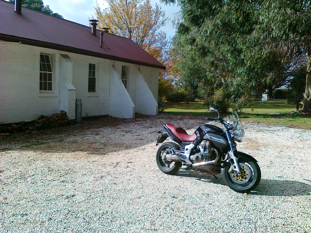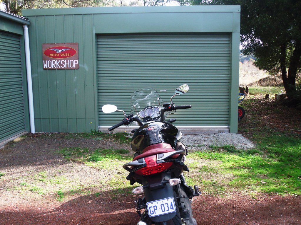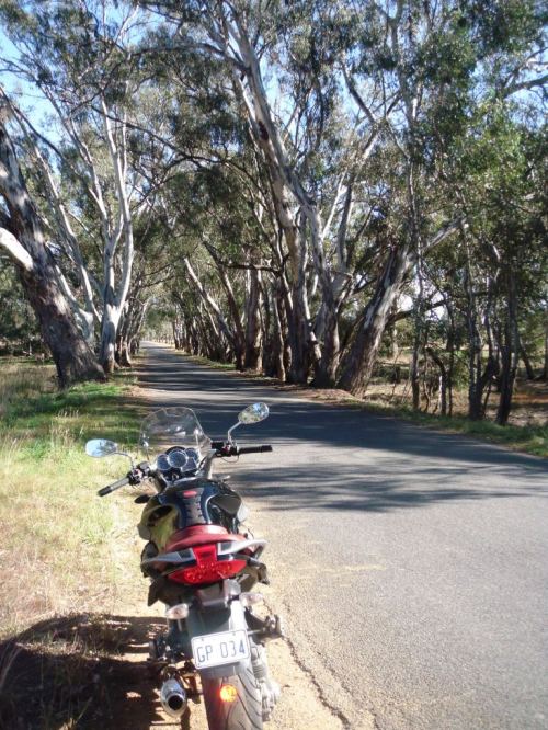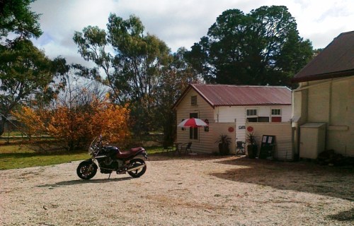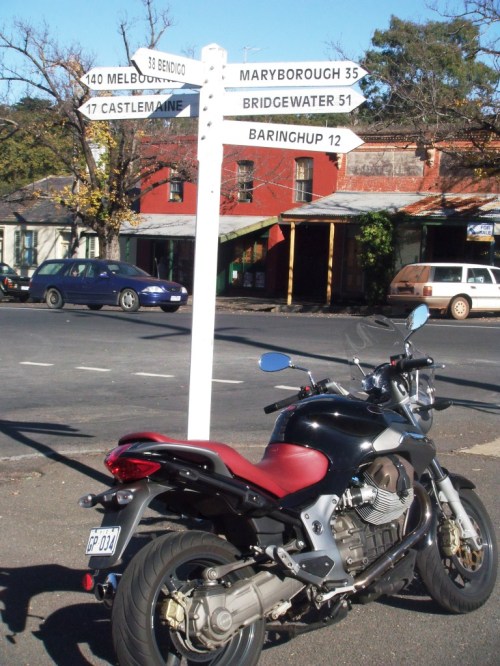 But fearlessly we turned at Ghin Ghin for Highlands – the rain started and the temperature dropped. The rain made the road greasy – not heavy enough to wash off the leaf litter – so we took it easy. By Ruffy the Chief was feeling a bit crook with the cold and had trouble getting off her Duke. After a quick walk, we set off for Yarck.