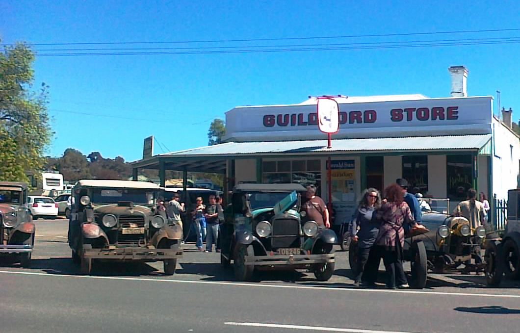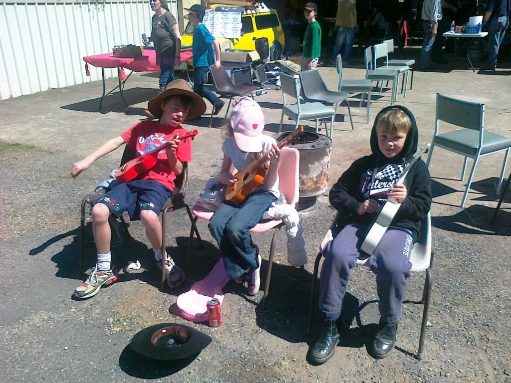 A beautiful spring day, cloudless and windless, so we mosied our way around on the bikes, stopping wherever. Eventually found ourselves at the Guildford Banjo Jamboree. The town was packed so we parked on the shoulder: