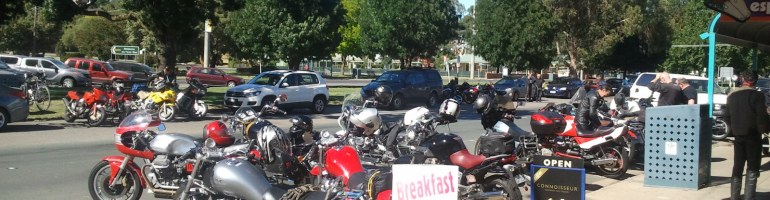 About three dozen bikes from the Moto Guzzi Club of Victoria converged on Marmalades for coffee prior to the run to Mansfield and Tolmie.