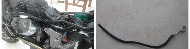 No, I couldn’t. I drained the sump and pulled the fuel tank off, after an argument with the quick-release fuel line, and examined the hose’s route through the engine. Cripes. Then, an epiphany…a brilliant idea that occasionally comes to bods who work on their own bikes. I pulled the starter motor off, after extracting the 30amp fuses, and all was revealed. Five minutes work and the hose was out. It seems that the hose had perished at the join and was oozing oil. The manner in which the bike had been assembled — with the fitting hard up against the back of the engine — had put pressure on the hose at this point, and it had perished at the junction over time.