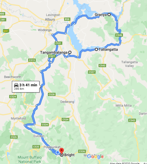 I came back via the Granya Gap Road, which has claimed a few motorcyclists over the years. The road was dry, except in a few corners where the sun don’t shine, and in very good condition. Then into Tallangatta for fuel. I could have come back via my preferred route, the Cow Pat Highway (Gundowring Road), so called because of the dairy farms along the route, but I’ve done it a few times recently so went via Tangambalanga and Yackandandah and Carrolls Road. A big black snake was absorbing some heat – a bit late in the season I thought – it was 14C.