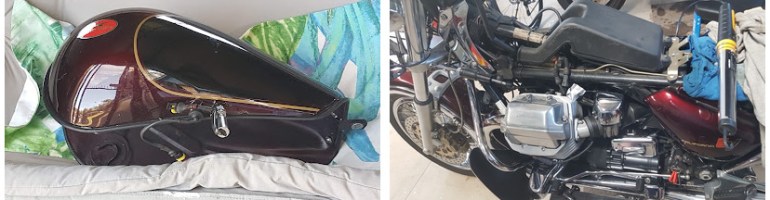 I poured some fuel into the tank and left it overnight. No leak. I smeared some rubber grease onto the locating bungs and eased the tank back on – the grease makes the job much easier – and reconnected cables and fuel hoses.