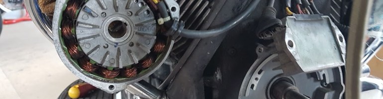 I inserted my screwdriver in on the flywheel teeth and tightened the nut holding the alternator to the crankshaft spindle, using my Stilson for extra leverage. On with the alloy cover. Job done! A few odds and ends to tidy up – horns, toe covers, exhaust headers, etc.