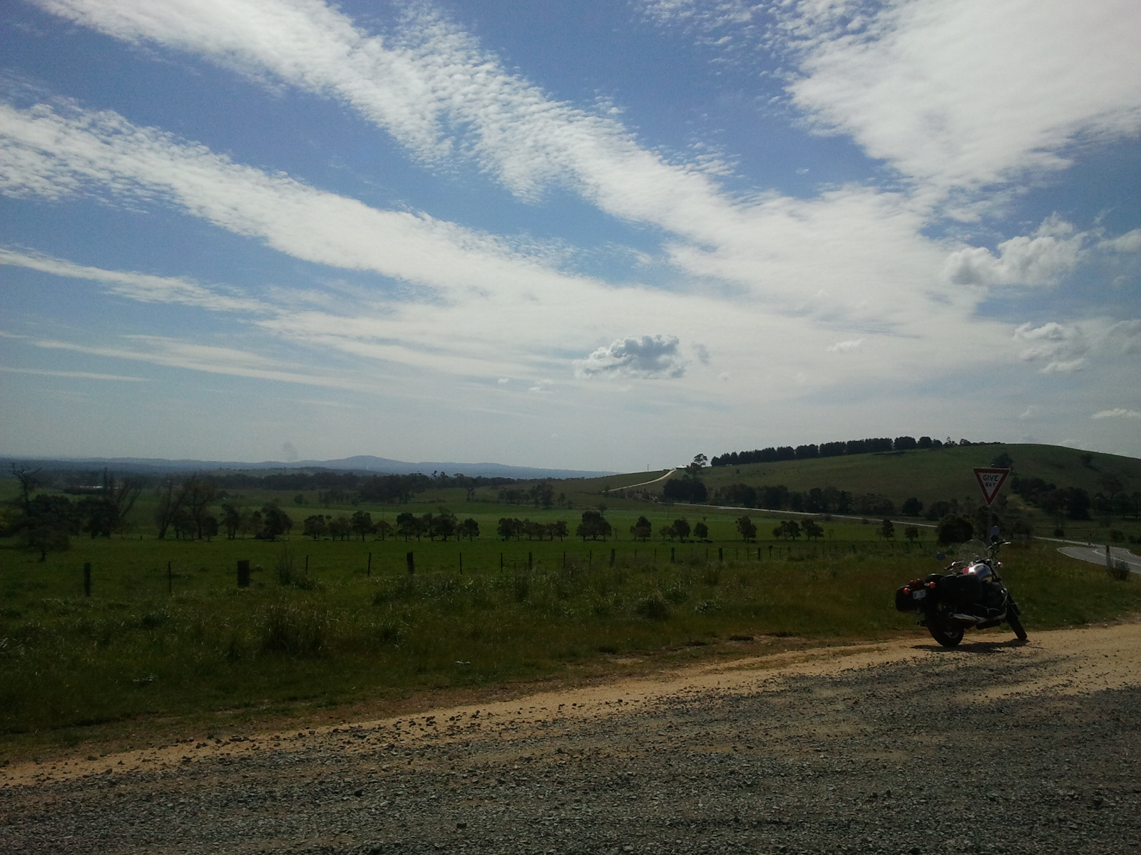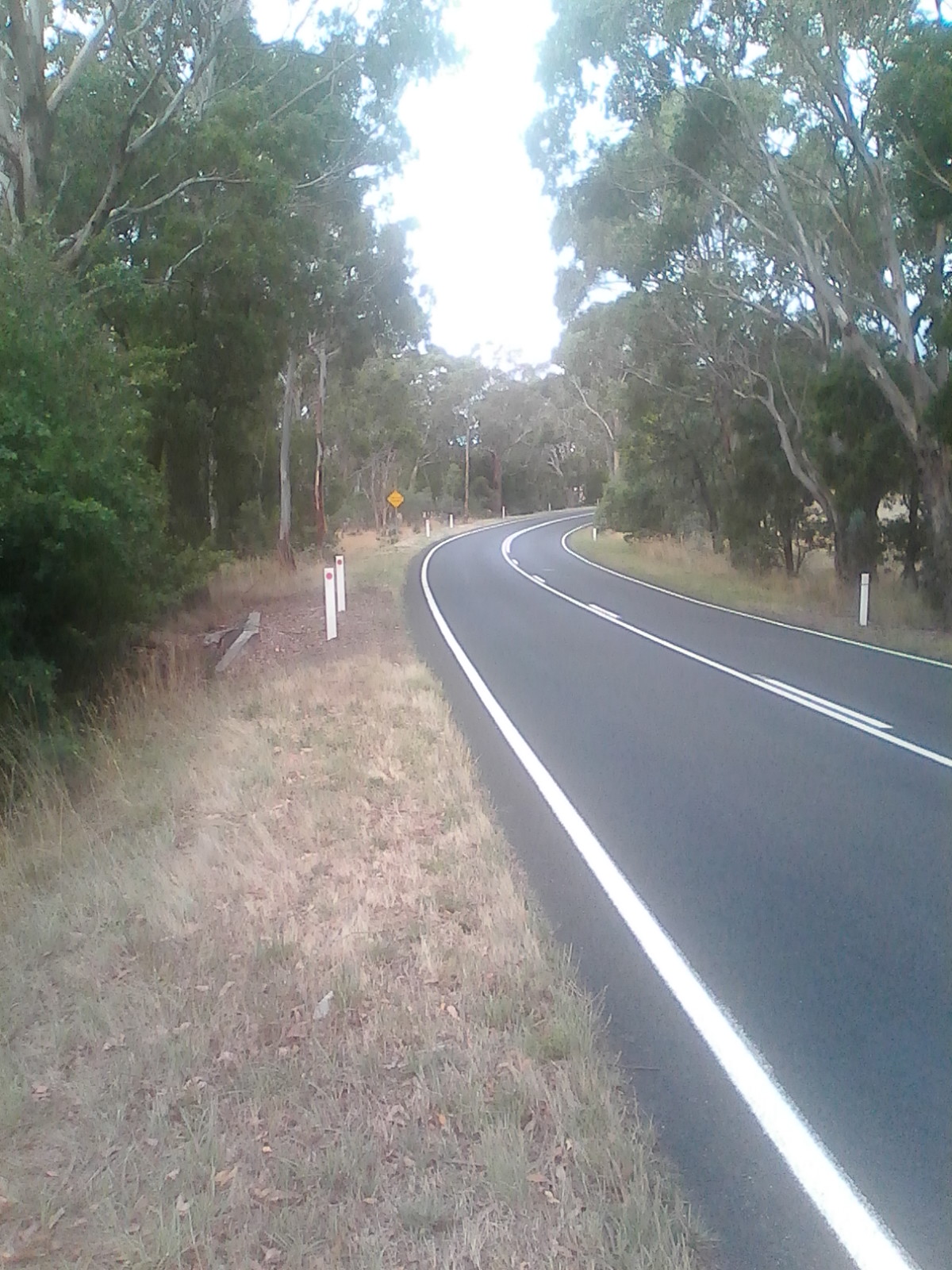As I approached this bend, a kangaroo sped from the left and hit my bike, probably the front rotor. There wasn’t any skid mark, which suggests that I was taken unaware. The Guzzi hit the road and speared off onto the edge straight ahead as the bend turned right. It seems to have flipped onto its other side at least once. I seem to have hit the road more on my left side, judging from my injuries, and tumbled. So the ‘roo was found dead in the foreground of this photo, and another vehicle found me sitting in the middle of the road near my bike, up at the bend, trying to remove my helmet and move off the road.