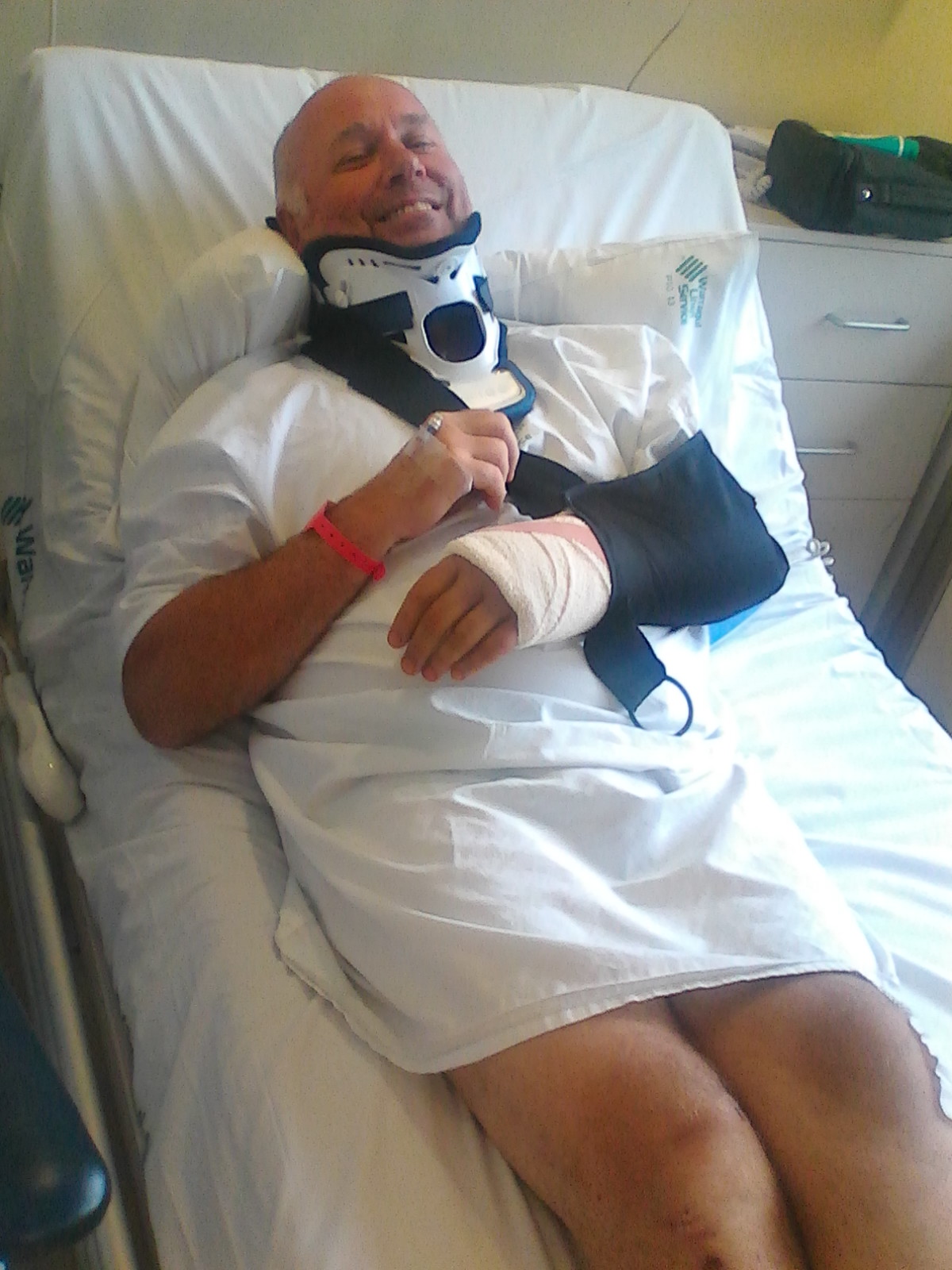 I was able to give them Jane’s phone number and she arrived before the police but after the ambulance. A local farmer had seen me pass and said that I was doing about 80km/hr. I have a vague recollection of the ambulance ride, laying on a hard board and running over every bump to Melbourne.